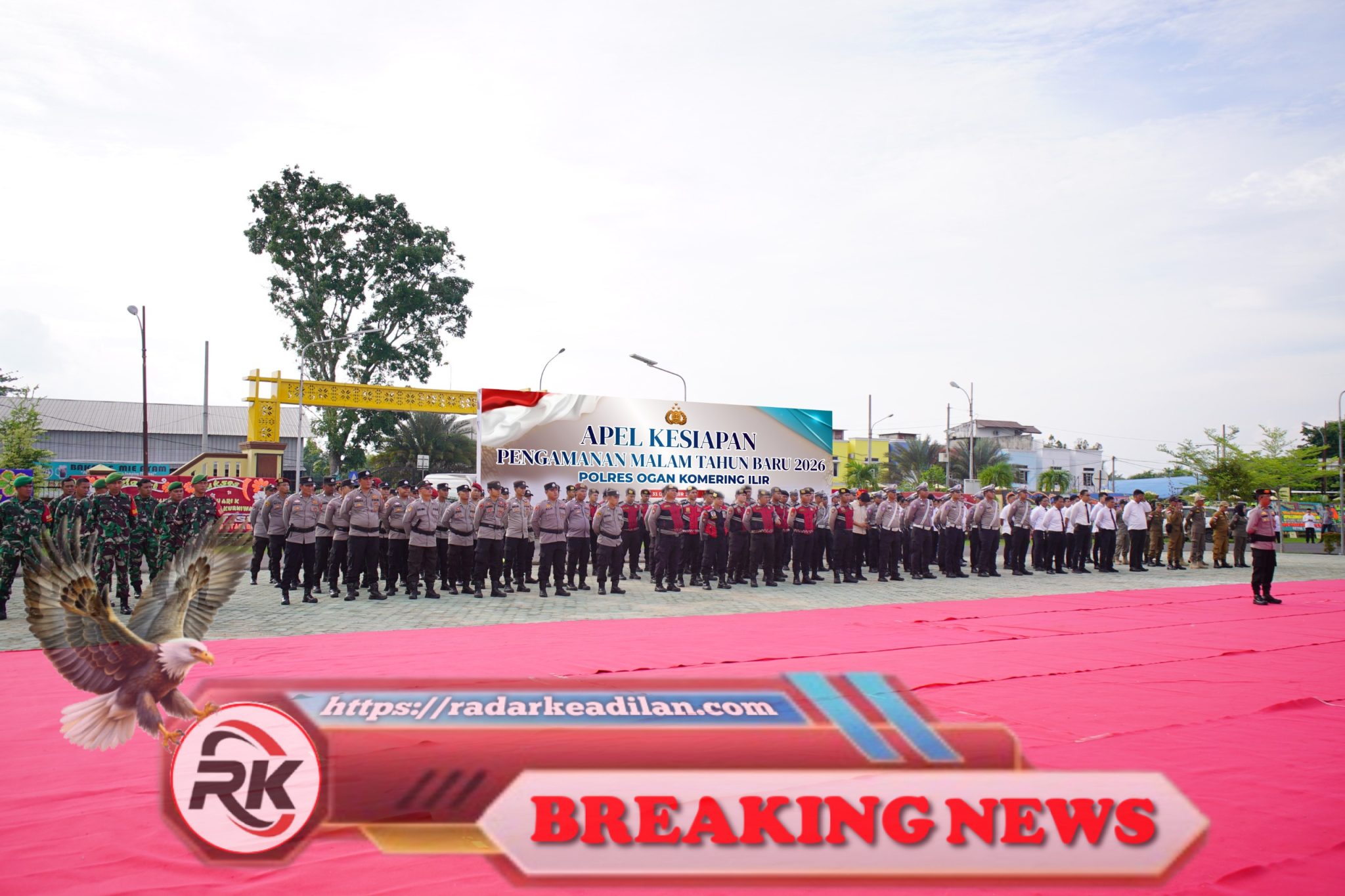 Barisan padat personel Polri, TNI, dan instansi terkait dalam apel kesiapan pengamanan Malam Tahun Baru 2026 di Lapangan Polres Ogan Komering Ilir, siap menjaga ketertiban dan keamanan masyarakat dengan semangat kolaboratif.|radarkeadilan.com