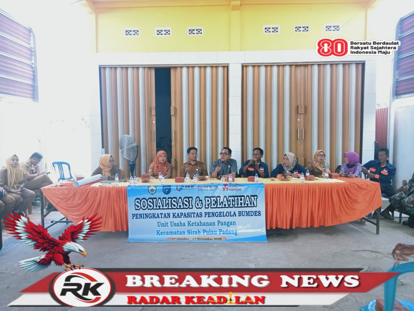 Camat SP Padang, Indra Husin, S.Sos., M.Si., memimpin sosialisasi dan pelatihan peningkatan kapasitas pengelola BUMDes Unit Usaha Ketahanan Pangan di Desa Ulak Jermun, Senin, 27 Oktober 2025, sebagai upaya mewujudkan kemandirian pangan desa./radarkeadilan.com
