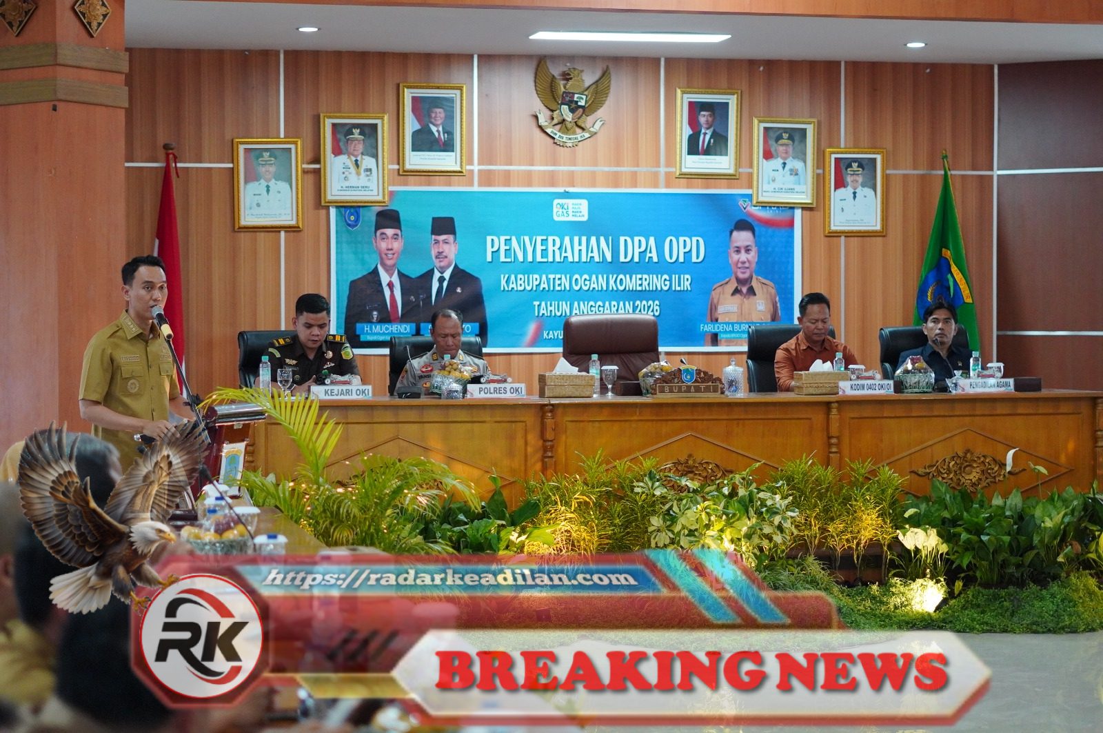 Kabupaten Ogan Komering Ilir (OKI), Selasa (13/1/2026) – Bupati OKI H. Muchendi Mahzareki, SE., M.Si. memberikan arahan resmi dalam acara penyerahan Dokumen Pelaksanaan Anggaran (DPA) kepada seluruh Organisasi Perangkat Daerah (OPD). Digelar di Ruang Rapat Bende Seguguk Kantor Bupati OKI, acara ini menegaskan komitmen percepatan realisasi anggaran Rp2.214 triliun dengan fokus pada program prioritas yang memberikan manfaat nyata bagi masyarakat OKI.|radarkeadilan.com