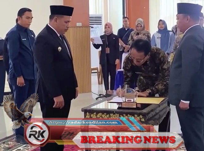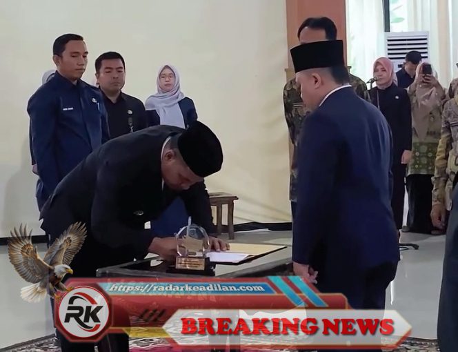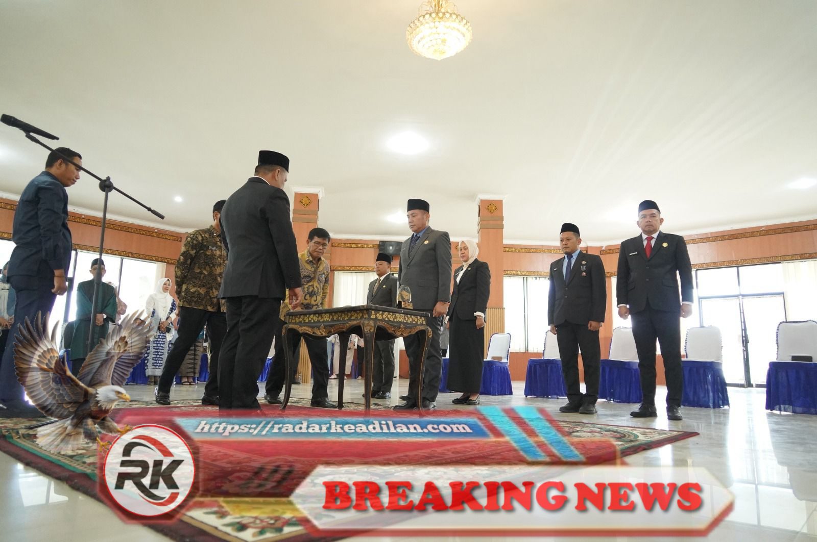 Prosesi penandatanganan berita acara oleh salah satu Pejabat Pimpinan Tinggi Pratama (JPTP) yang baru dilantik, disaksikan oleh Wakil Bupati OKI, Supriyanto, SH, di Kantor Bupati OKI, Jumat (28/11/2025)./radarkeadilan.com