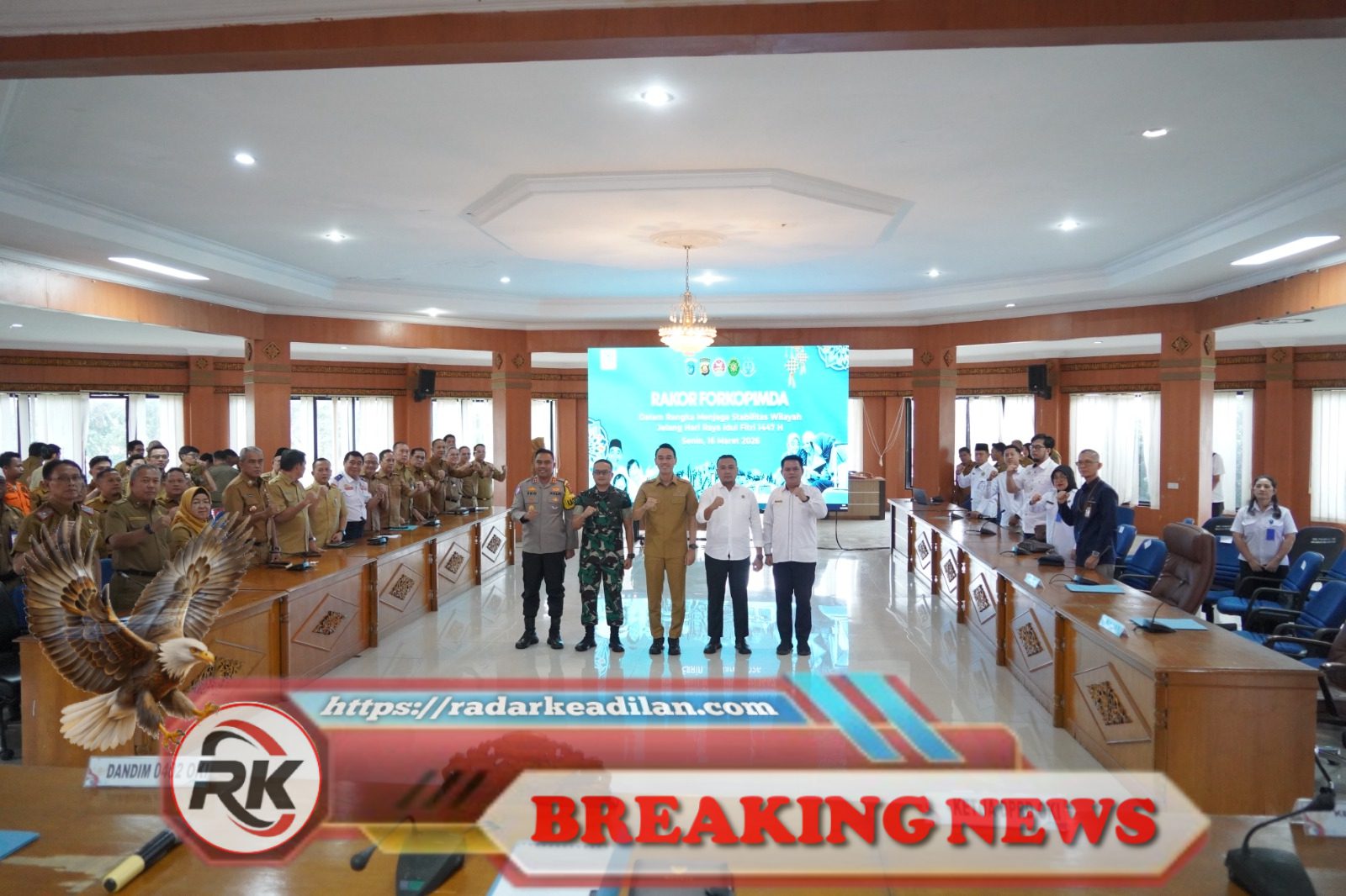 Kegiatan koordinasi berlangsung Senin, 16 Maret 2026, di Ruang Rapat Bende Seguguk I, dengan pimpinan langsung dari Bupati OKI H. Muchendi Mahzareki dan kehadiran seluruh unsur Forkopimda, Organisasi Perangkat Daerah (OPD) terkait, serta instansi vertikal.