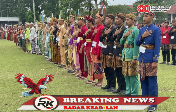 Puluhan pemuda dari berbagai suku di Indonesia, dengan bangga mengenakan pakaian adat masing-masing, berkumpul di halaman kantor Bupati OKI untuk mengikuti upacara peringatan Sumpah Pemuda.
