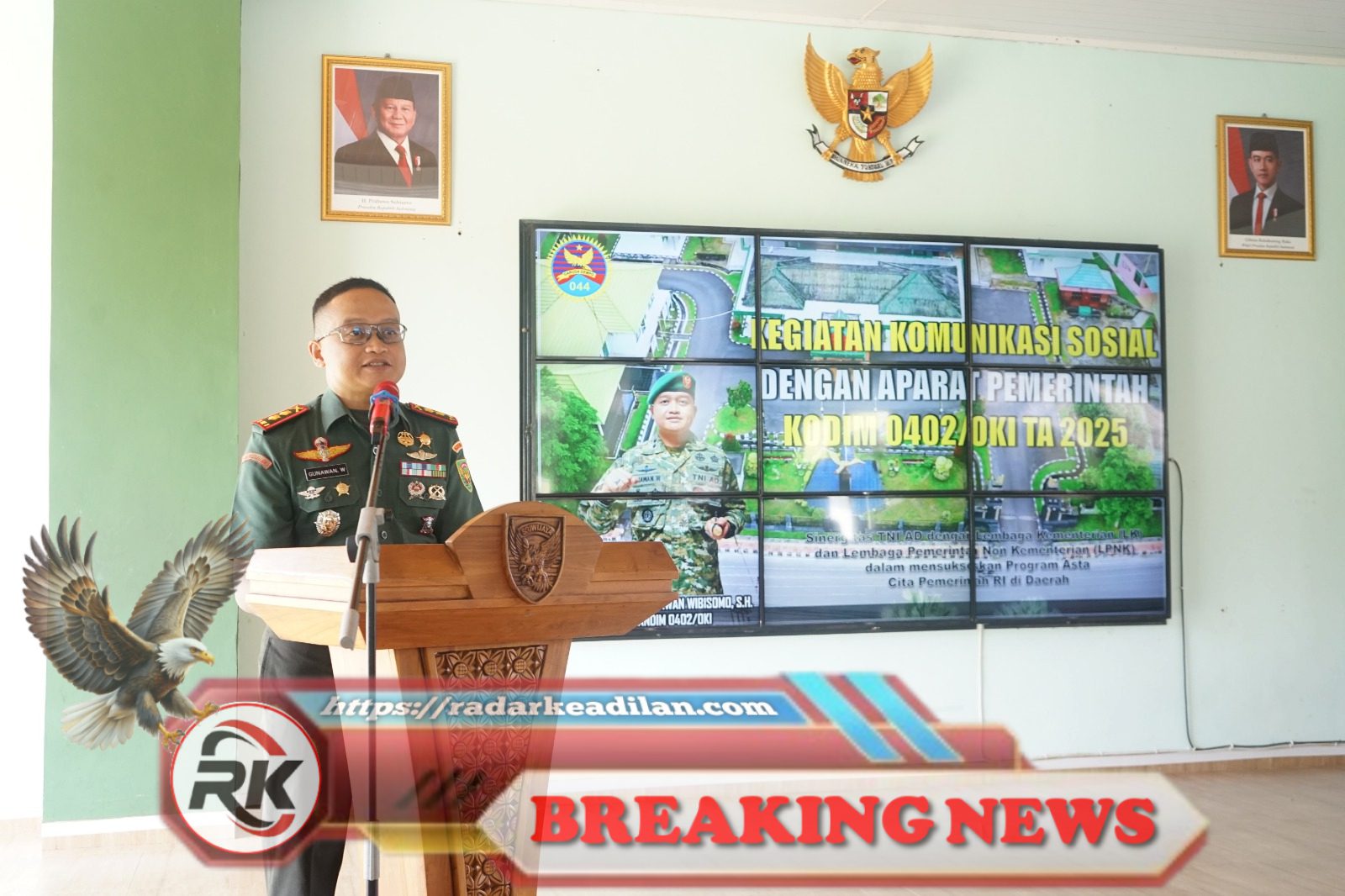 Letkol Inf Gunawan Wibisono, S.H., Dandim 0402/OKI-OI, menyampaikan paparan strategis dalam kegiatan Komsos yang bertujuan menyinergikan TNI AD dengan berbagai lembaga pemerintah demi suksesnya Program Asta Cita, Kamis (20/11/2025)./radarkeadilan.com