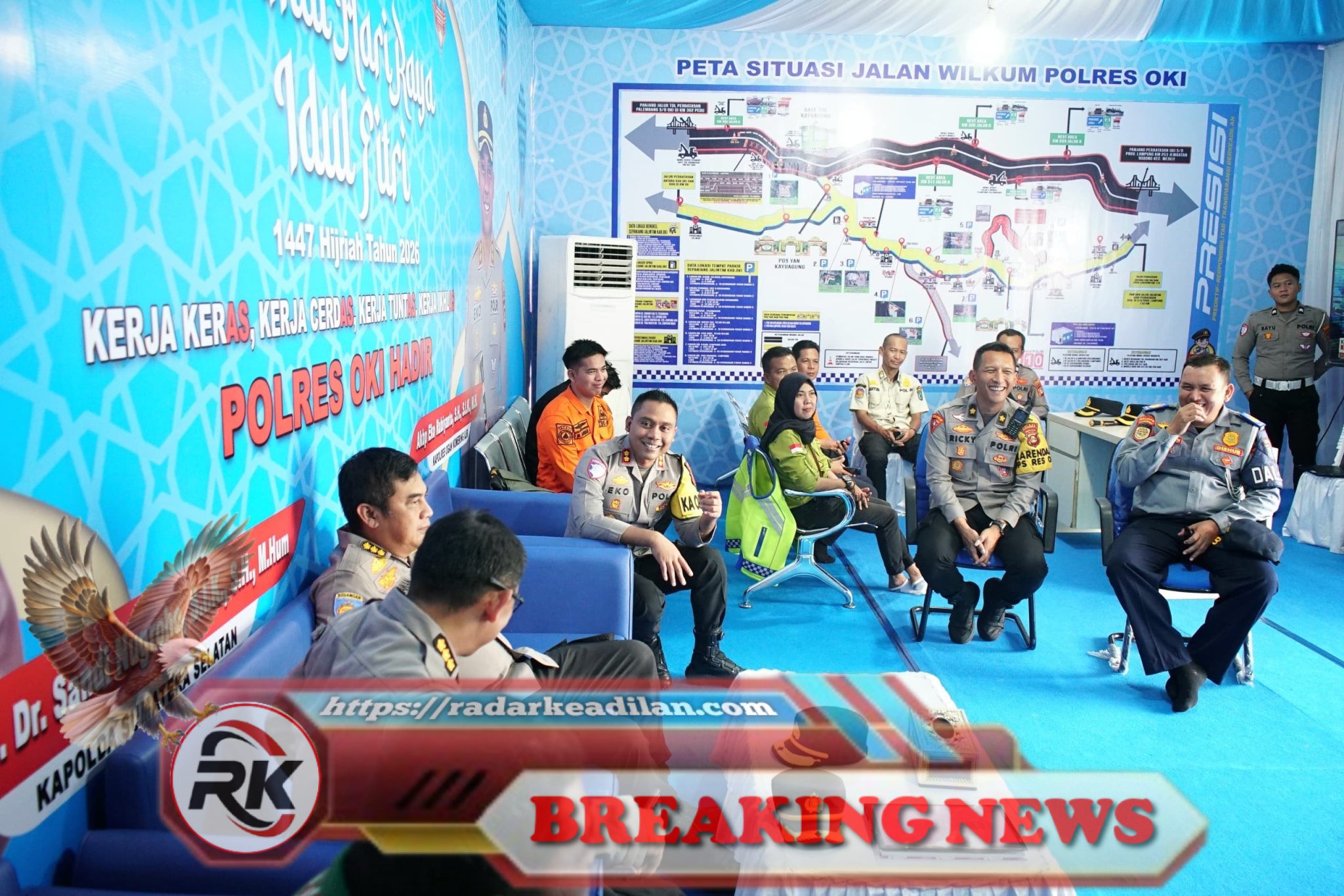 Personel Polres Ogan Komering Ilir (OKI) bersama jajaran terkait berkumpul dalam suasana kondusif, dengan latar peta situasi jalan wilayah hukum Polres OKI yang siap mendukung pengamanan arus mudik dan pelayanan masyarakat pada Hari Raya Idul Fitri 1447 Hijriah Tahun 2026. Semangat kerja keras, cerdas, dan tuntas tercermin dalam persiapan yang matang untuk menjamin kamtibmas yang aman dan kondusif.| HS, radarkeadilan.com