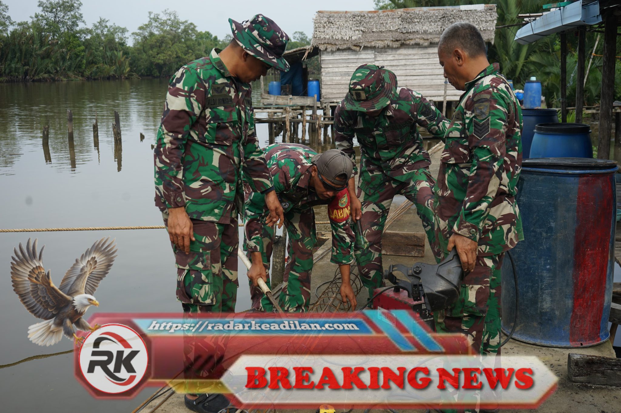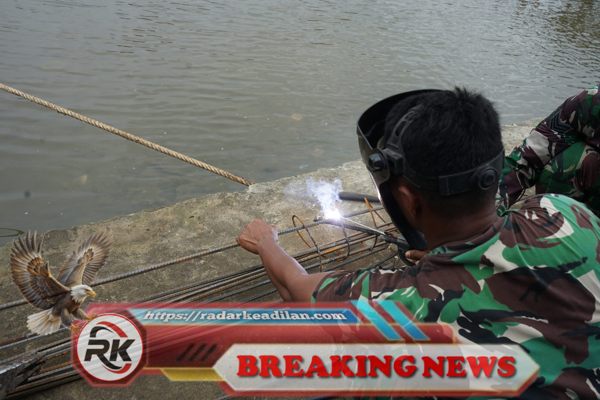Personel dalam seragam loreng fokus melakukan pengelasan besi tulangan sebagai bagian dari pembuatan rangka Strauss Pile untuk pondasi jembatan gantung di Ogan Komering Ilir. Kerja dilakukan di tepian perairan dengan penuh ketelitian guna memastikan struktur dasar memiliki kekuatan dan presisi yang sesuai standar teknis.|HS, radarkeadilan.com