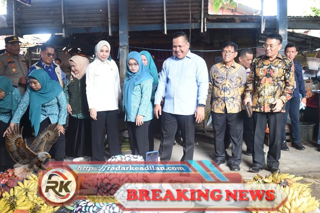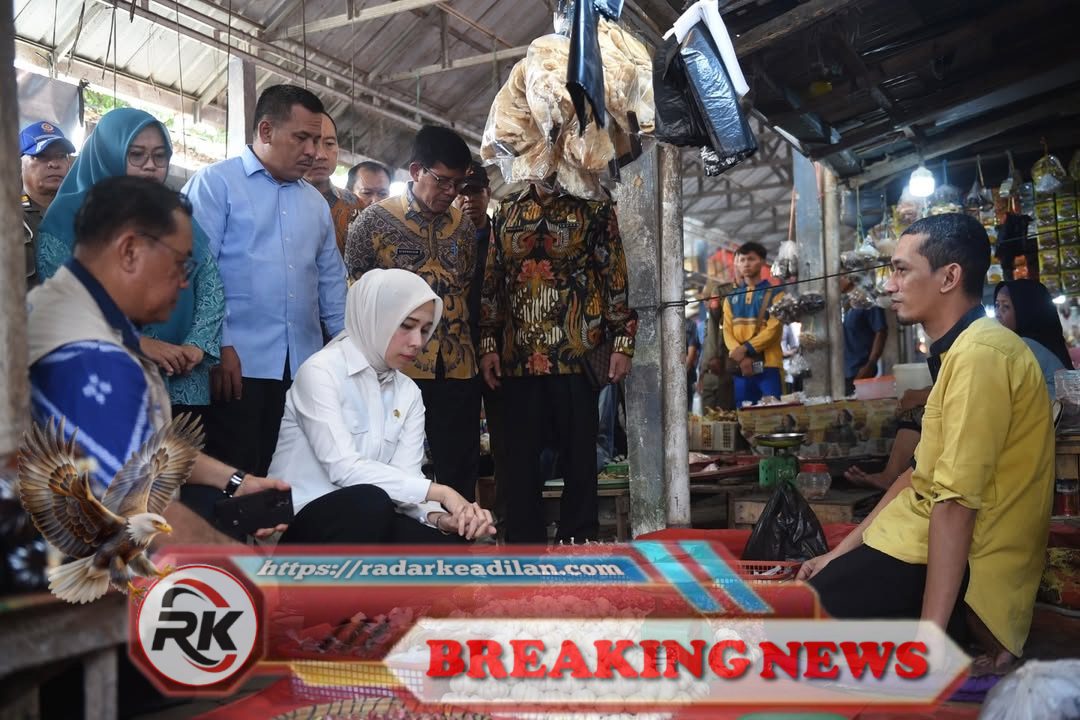 Ketua Dekranasda dan TP PKK Kabupaten OKI, Ny. Hj. Ike Meilina Muchendi, SE., M.Si., bersama jajaran Pemerintah Kabupaten Ogan Komering Ilir (OKI), aktif berdialog dengan pedagang dan masyarakat saat meninjau langsung harga dan ketersediaan bahan pokok di pasar utama dalam rangka Operasi Pasar Murah. (Jum’at, 28/11/2025)./radarkeadilan.com