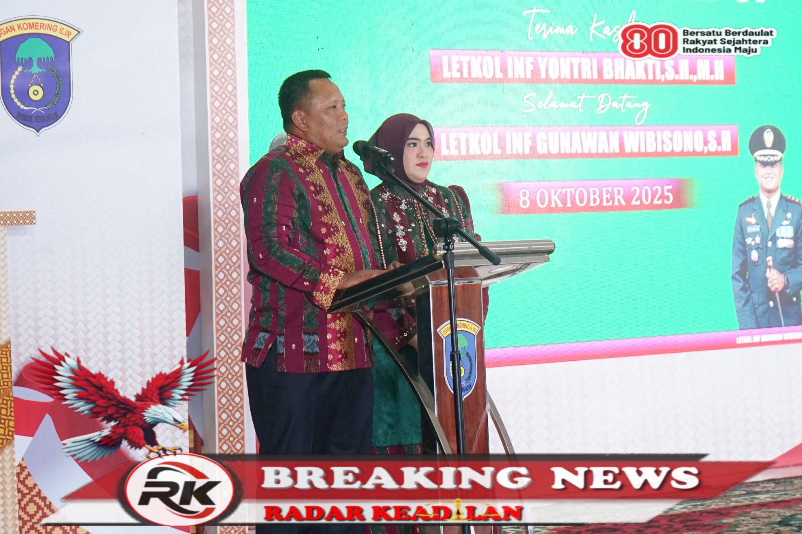 Dandim 0402/OKI-OI, Letkol Inf Gunawan, menyampaikan komitmennya untuk bersinergi dengan masyarakat dan pemerintah daerah dalam menjaga stabilitas dan mendukung pembangunan wilayah OKI dan Ogan Ilir pada acara pisah sambut di Pendopo Kabupaten OKI, Rabu (8/10/2025)./radarkeadilan.com