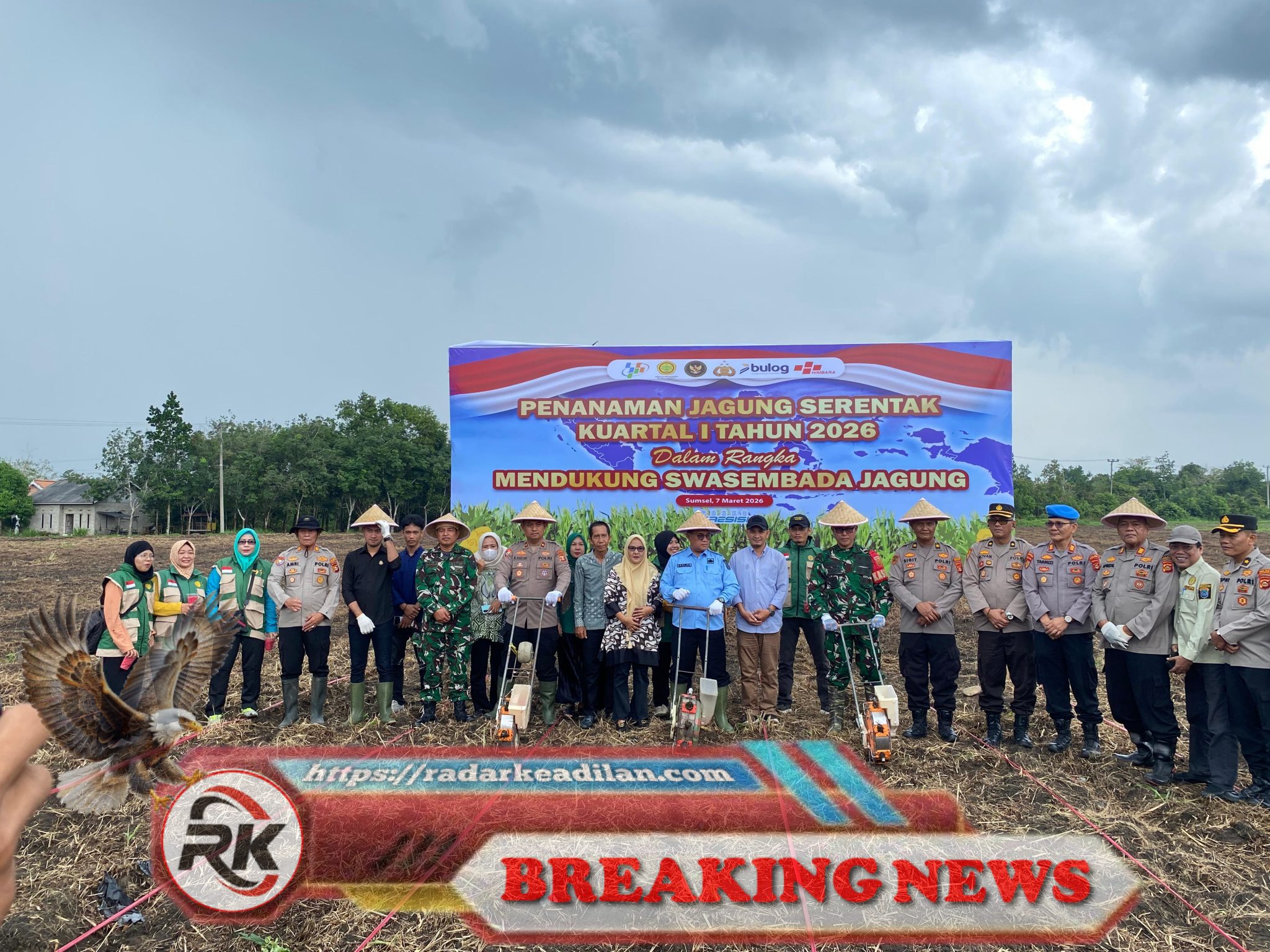 Para peserta Kegiatan Penanaman Jagung Serentak Kuartal I Tahun 2026 siap melaksanakan penanaman di lahan lokasi acara di Kabupaten Ogan Komering Ilir, Sabtu (7/3/2026). Dengan membawa alat tanam dan mengenakan topi lombok, unsur Polri, TNI, pemerintah daerah, serta berbagai pemangku kepentingan turut berperan aktif dalam upaya mendukung swasembada jagung dan menguatkan ketahanan pangan nasional.| HS, radarkeadilan.com