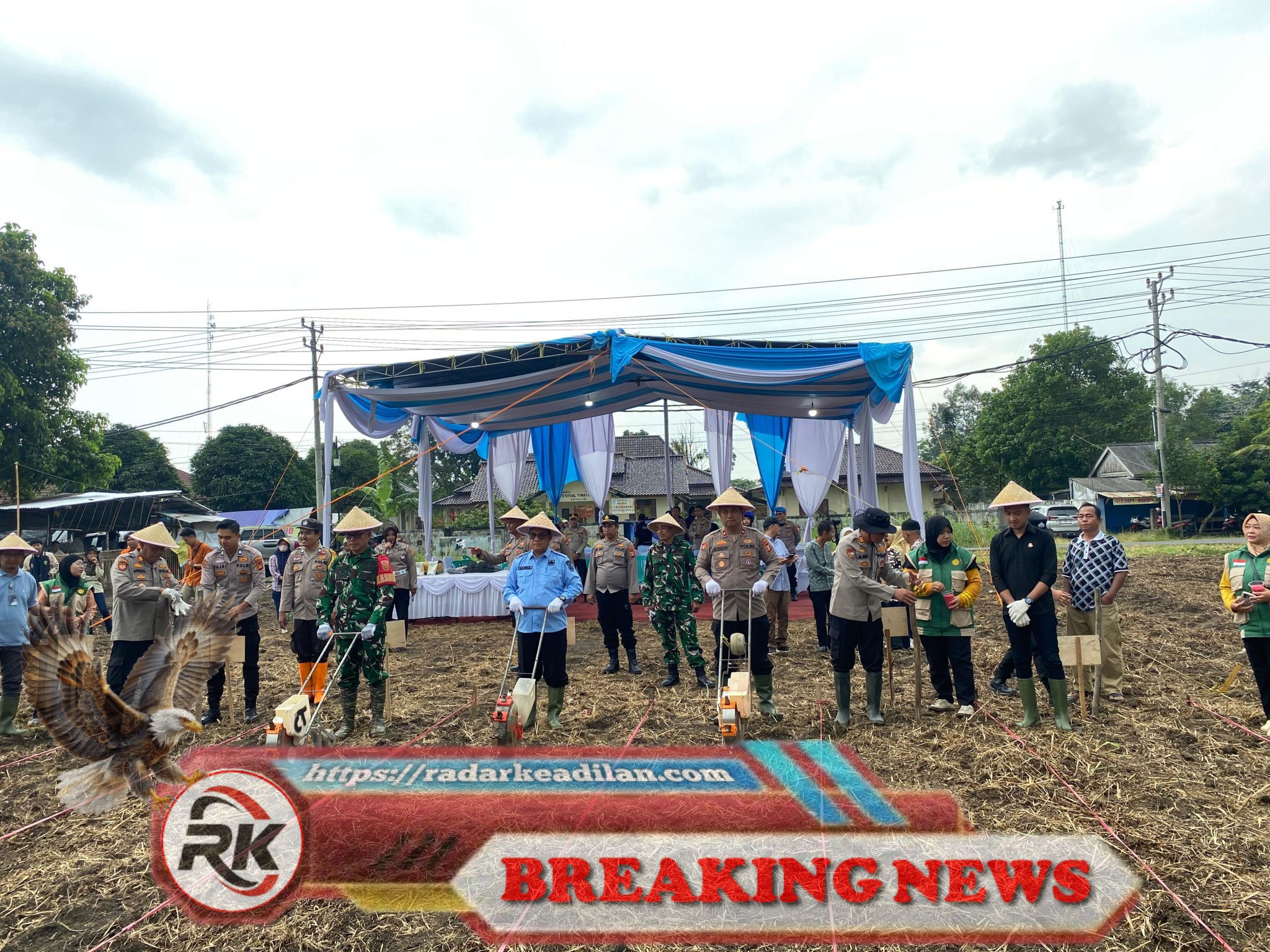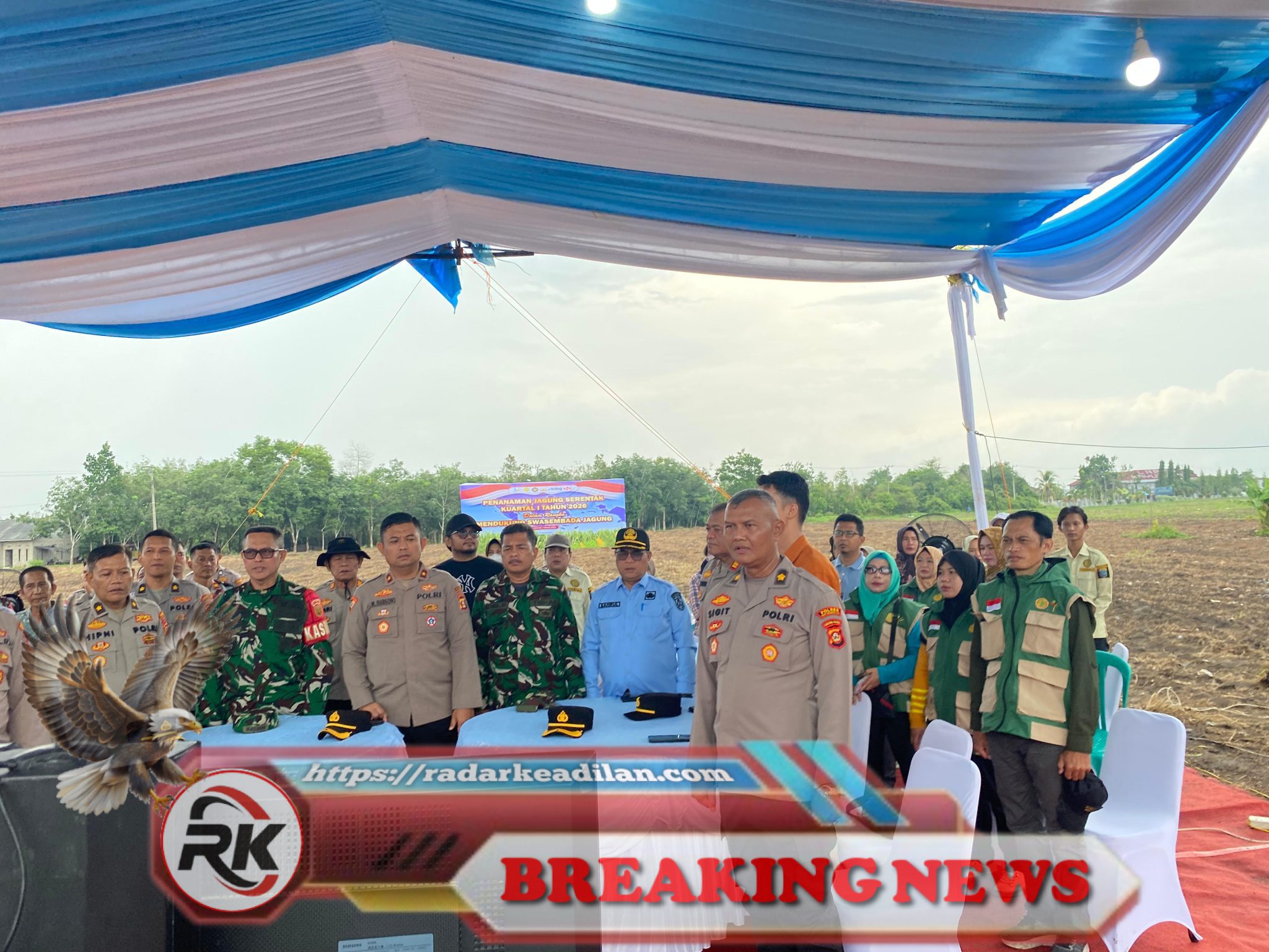 Para peserta dan unsur penyelenggara Kegiatan Penanaman Jagung Serentak Kuartal I Tahun 2026 berkumpul di bawah tenda acara di lokasi penanaman di Kabupaten Ogan Komering Ilir, Sabtu (7/3/2026). Dalam kegiatan yang mendukung swasembada jagung ini, unsur Polri, TNI, pemerintah daerah, serta berbagai pemangku kepentingan mengikuti sambungan rapat daring bersama Kapolri untuk menyaksikan pelaksanaan program penunjang ketahanan pangan nasional.| HS, radarkeadilan.com
