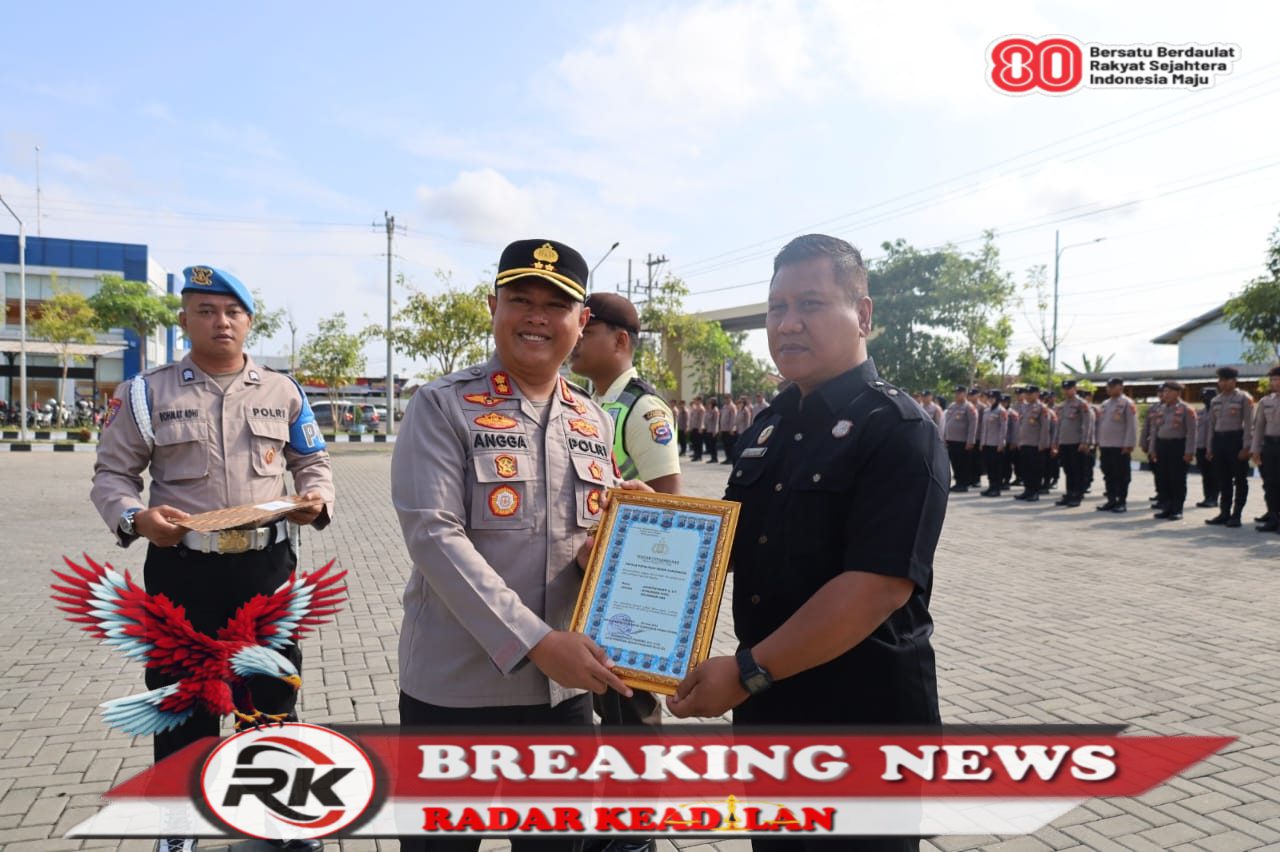 Apresiasi Polres Sukoharjo: Kapolres AKBP Anggaito Hadi Prabowo memberikan penghargaan kepada perwakilan Pam Swakarsa atas kontribusi dalam pengungkapan kasus curanmor, pada apel Commander Wish di Polres Sukoharjo, Senin (27/10/2025)./Gunadi Pramono, radarkeadilan.com