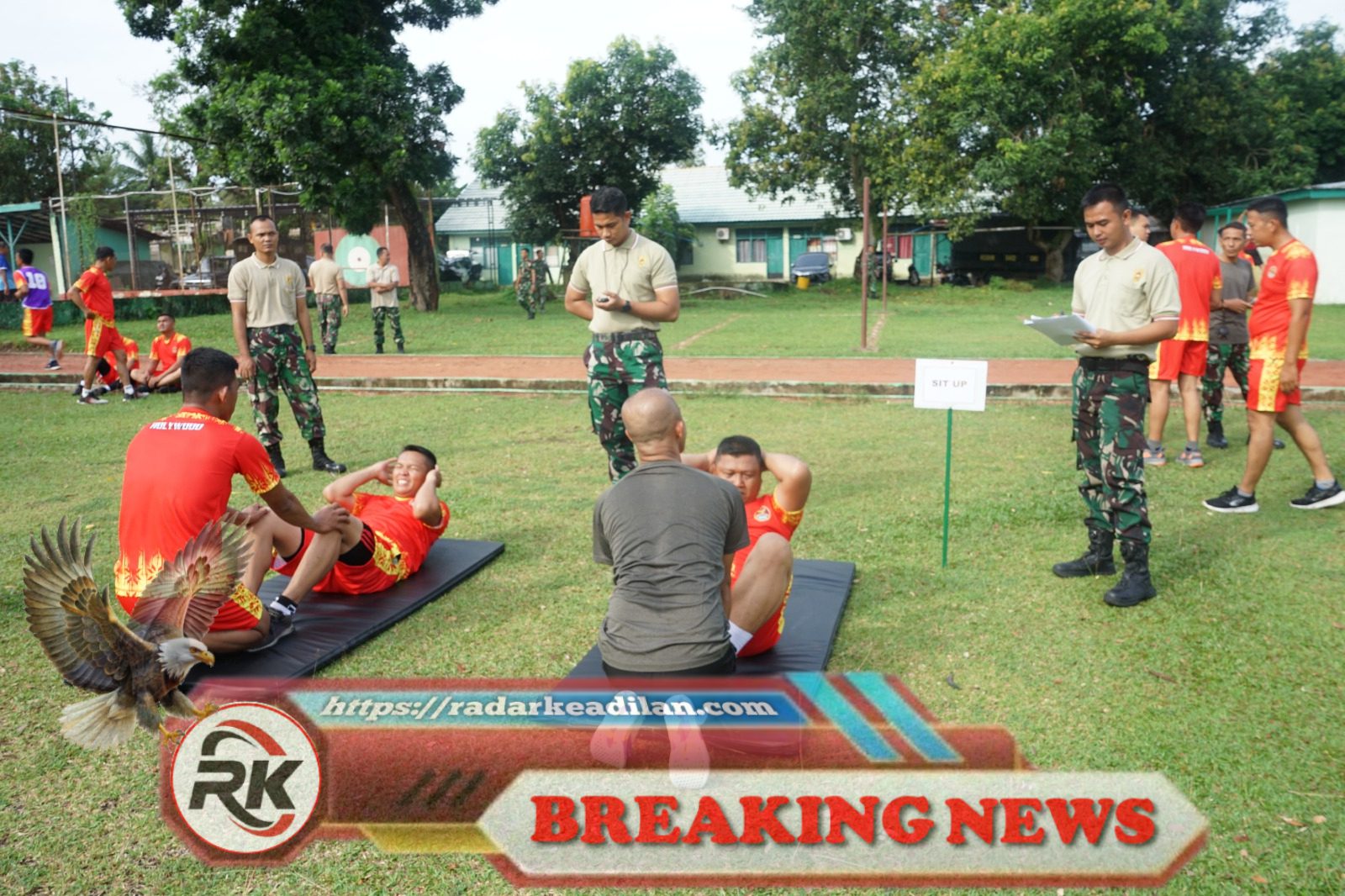 Prajurit Kodim 0402/OKI-OI berjuang menyelesaikan tes sit-up sebagai bagian dari Kesegaran Jasmani (Garjas) Periodik Semester II Tahun 2025 di Lapangan Makodim 0402/OKI-OI, Jumat (14/11/2025)./radarkeadilan.com