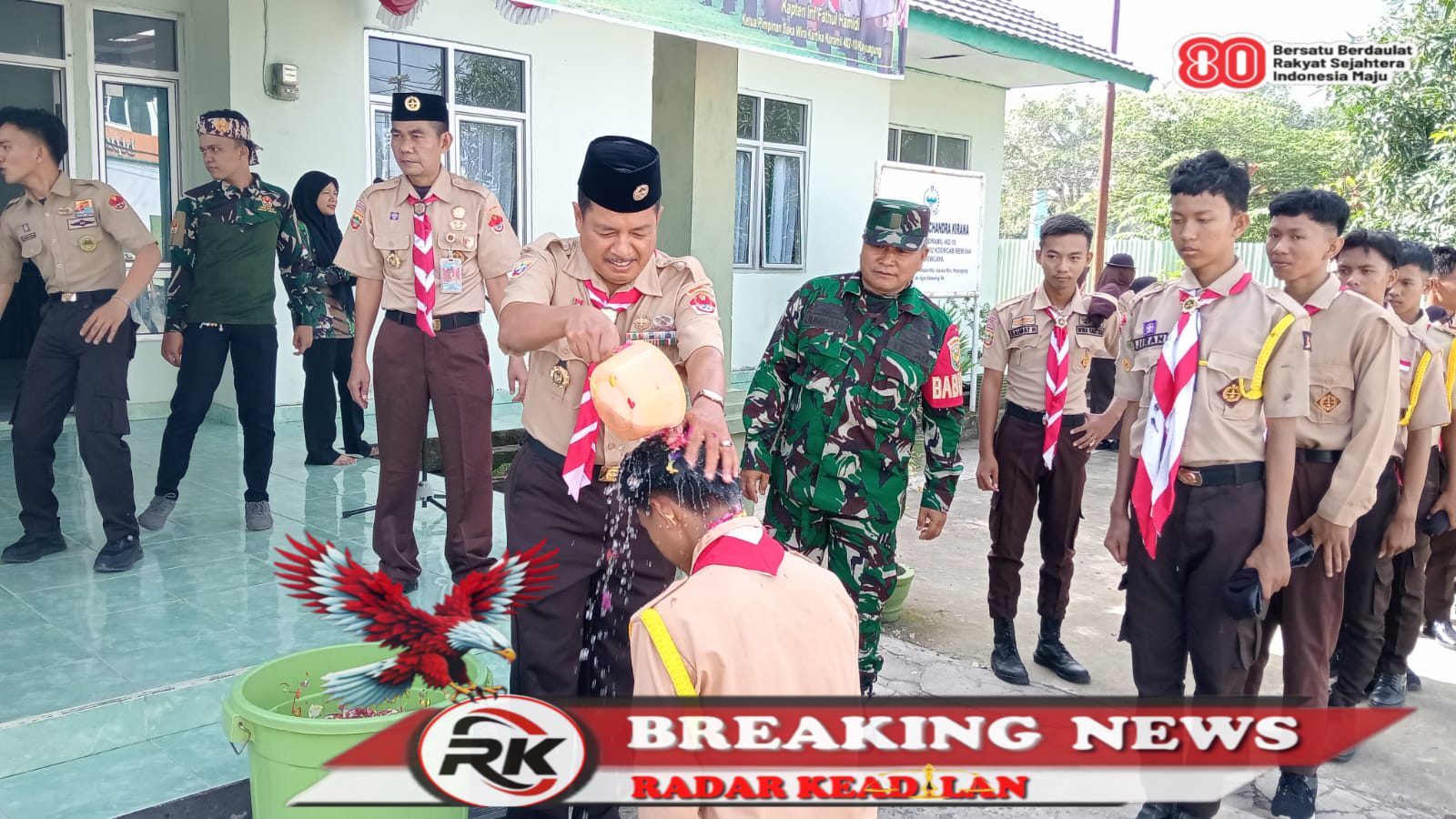 Prosesi penyiraman air kembang menjadi bagian dari tradisi pelantikan anggota baru Pramuka Saka Wira Kartika Koramil 402-10/Kayuagung, sebagai simbol penyucian diri dan semangat baru dalam berbakti kepada bangsa dan negara, Sabtu (25/10/2025)./radarkeadilan.com
