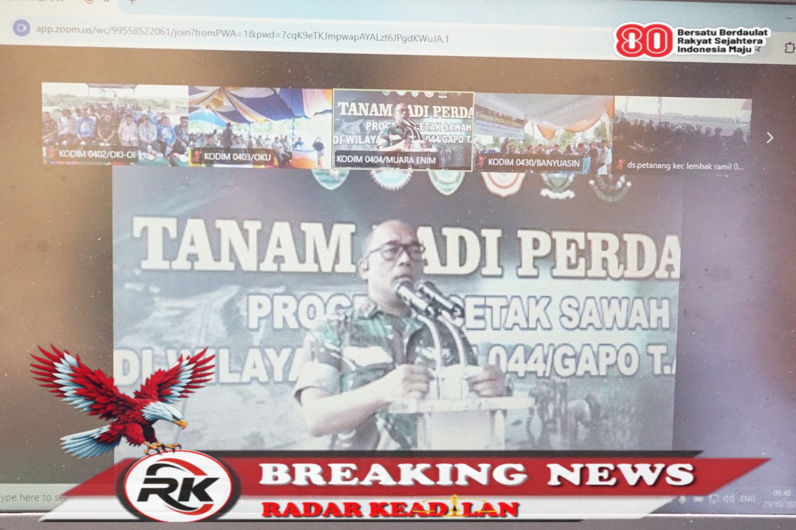 Arahan dari Danrem: Brigjen TNI Adri Koesdyanto memberikan arahan melalui konferensi video (vidcon) kepada jajaran Kodim di wilayah Korem 044/Gapo terkait pelaksanaan Program Cetak Sawah 2025, menegaskan komitmen TNI dalam mendukung ketahanan pangan nasional./radarkeadilan.com