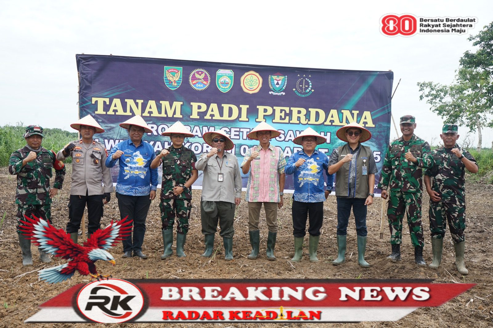 Dedikasi untuk Ketahanan Pangan: Dandim 0402/OKI-OI, Letkol Inf Gunawan Wibisono, S.H., bersama Sekda OKI, Ir. H. Asmar Wijaya, M.Si., dan Kepala DKPTPH OKI, Ir. Irawan, M.M., memimpin langsung kegiatan Tanam Padi Perdana Program Cetak Sawah 2025 seluas 20 hektare di Desa Benawa, Ogan Komering Ilir, pada Kamis (23/10/2025), sebagai wujud nyata sinergi dalam memperkuat sektor pertanian daerah./radarkeadilan.com