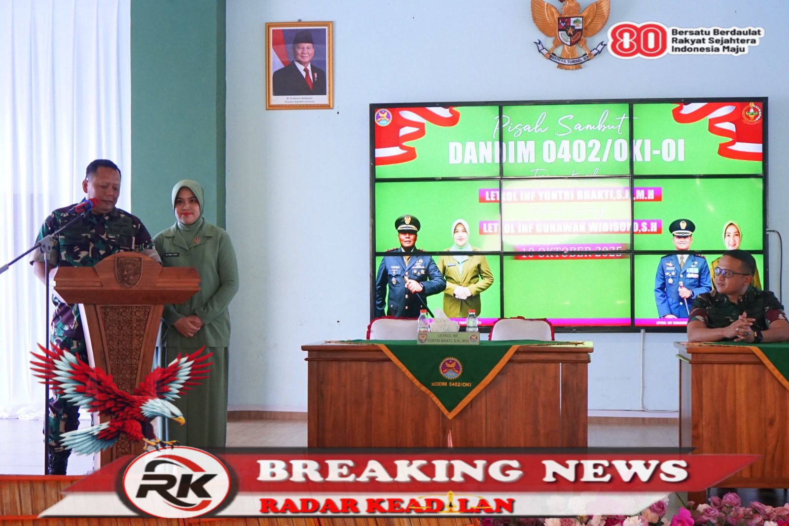 Ogan Komering Ilir, Radar Keadilan Suasana haru dan khidmat mewarnai acara lepas sambut Komandan Kodim (Dandim) 0402/OKI-OI, Jum’at (10/10/2025), di Aula Darma Wangsa Makodim 0402/OKI-OI.