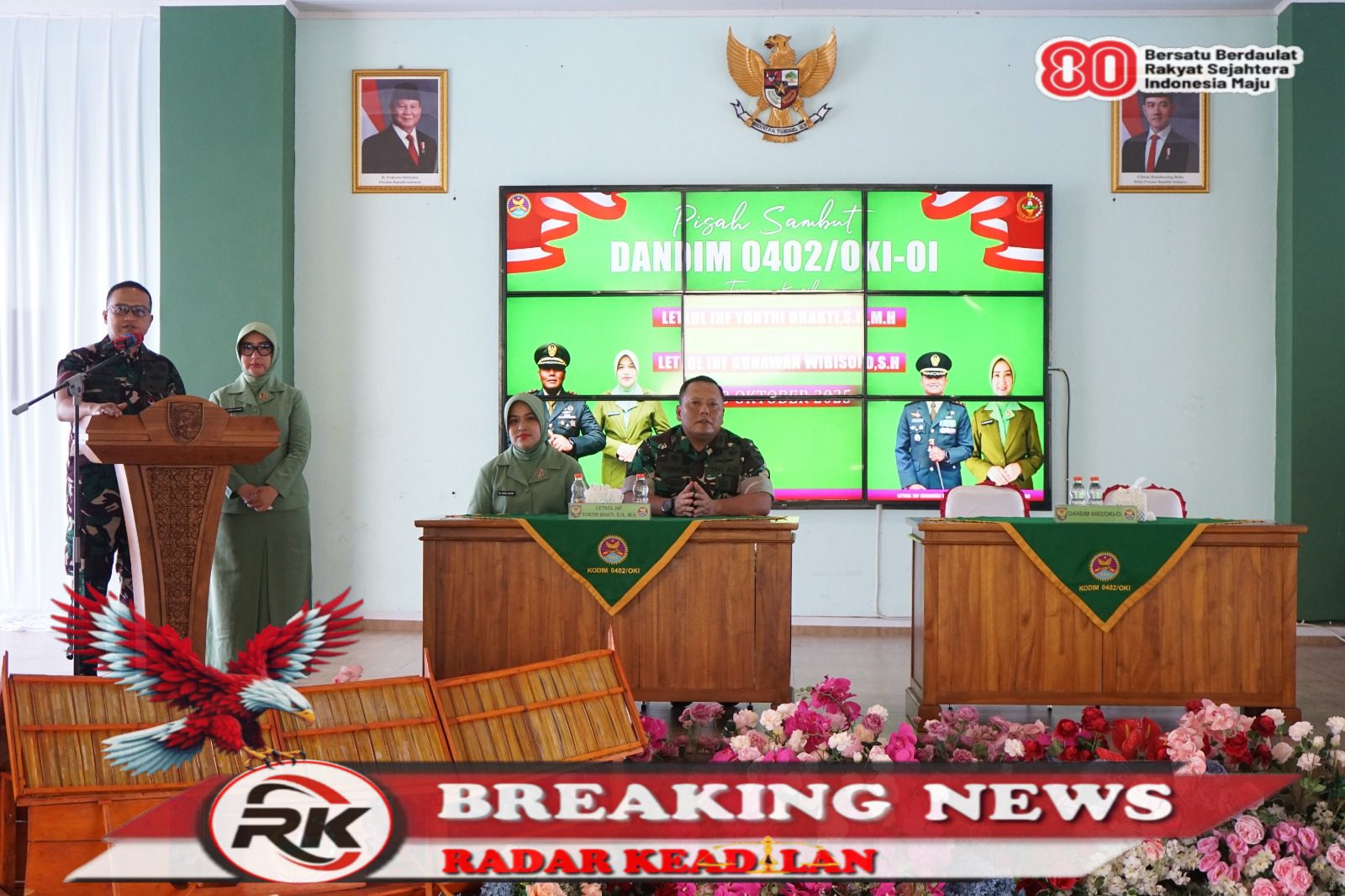 Ogan Komering Ilir, Radar Keadilan Suasana haru dan khidmat mewarnai acara lepas sambut Komandan Kodim (Dandim) 0402/OKI-OI, Jum’at (10/10/2025), di Aula Darma Wangsa Makodim 0402/OKI-OI.
