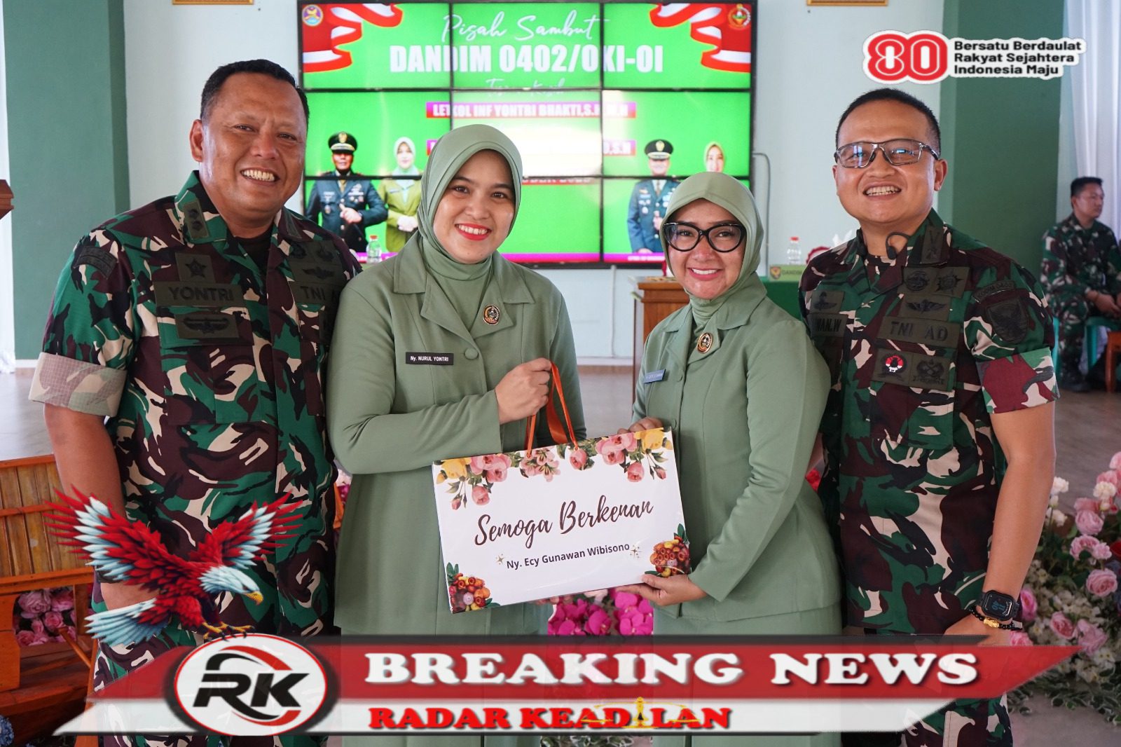 Kebersamaan Letkol Inf Yontri Bhakti, S.H., M.H., Ny. Nurul Yontri, Letkol Inf Gunawan Wibisono, S.H., dan Ny. Dessi Gunawan, dalam acara perpisahan dan serah terima jabatan di Kodim 0402/OKI-OI./radarkeadilan.com